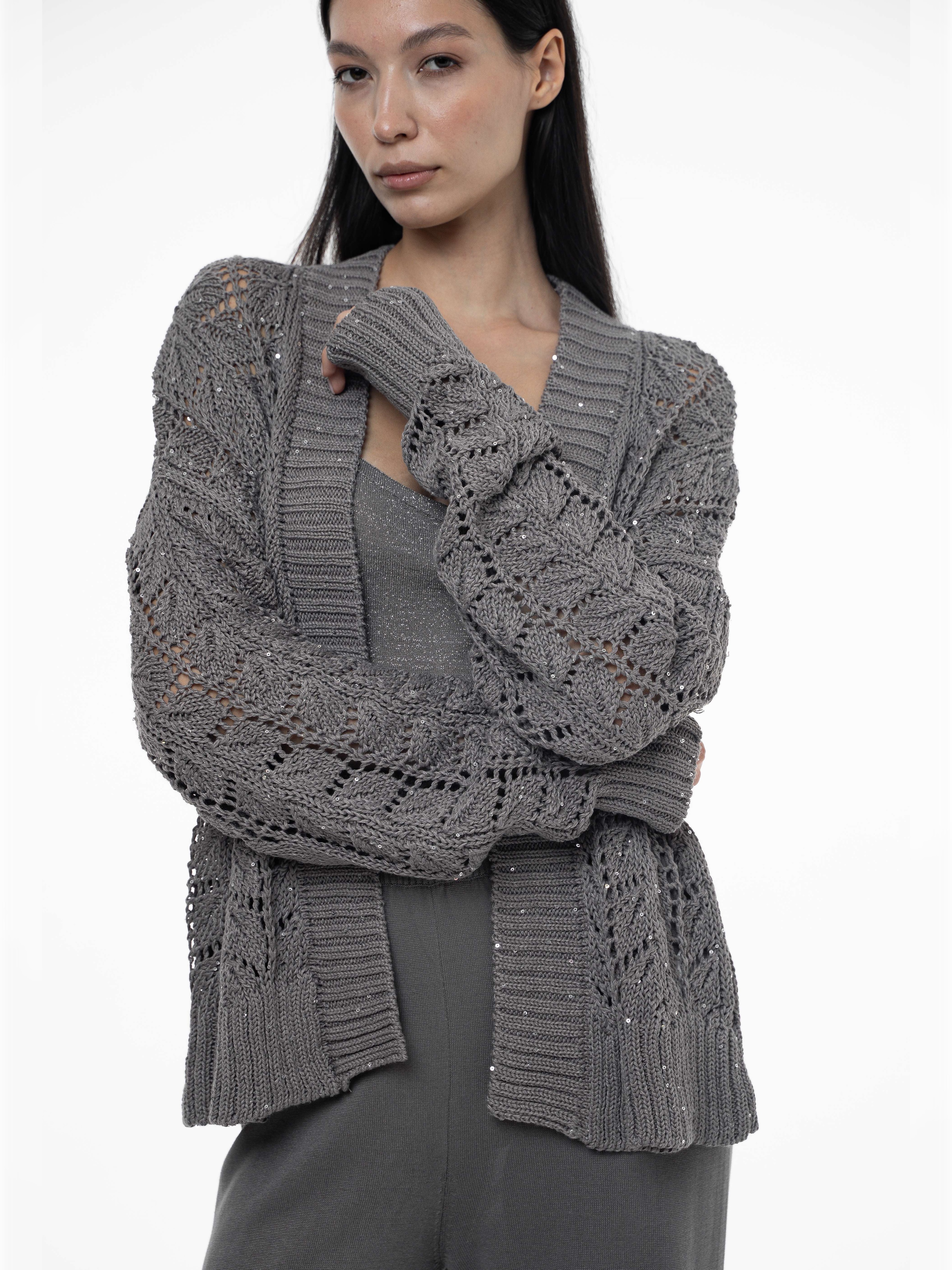 Кардиган CodeFive выполненн из пряжи хлопка с вплетенными пайетками с крупной ажурной вязкой. Расслабленный вид модели подчеркнет бунтарский образ и индивидуальность.
